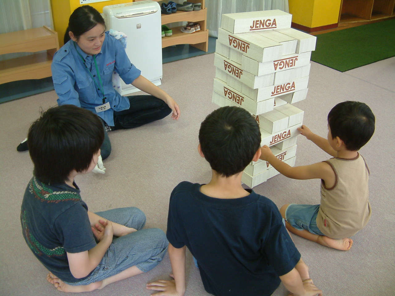 小さい子に、年上の子がジャンボジェンガのやりかたを