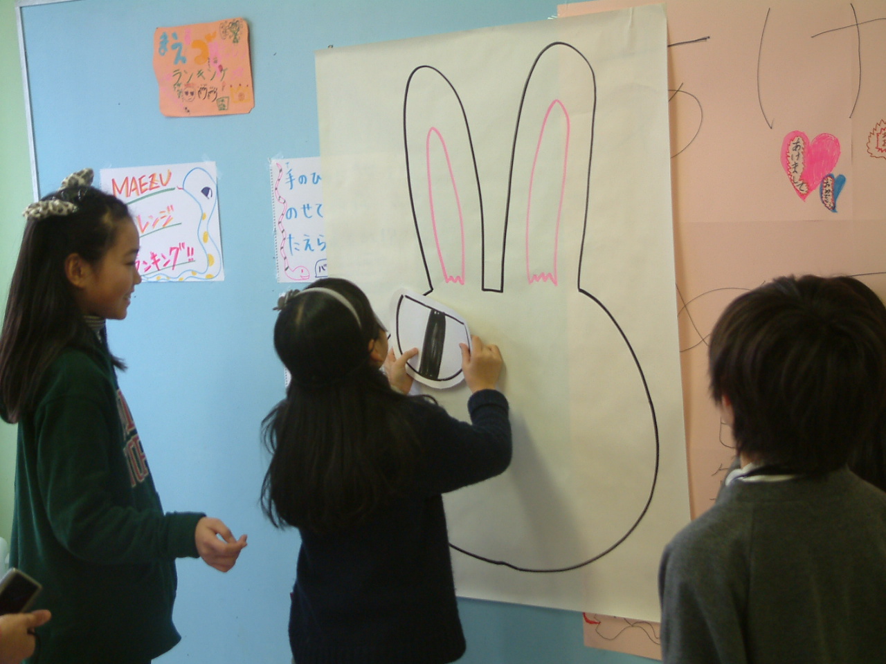クリスマス福笑いでは会場のみんなのアドバイスでサンタさんとトナカイさんが完成したよ。